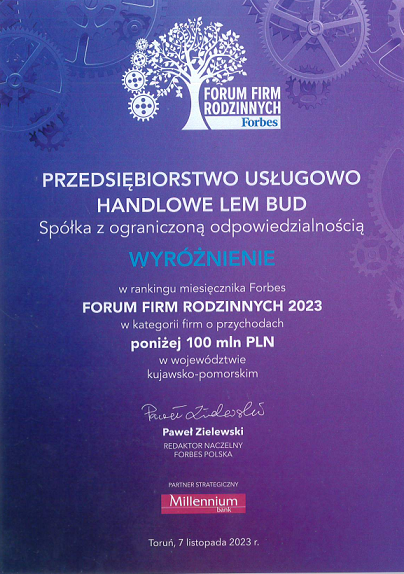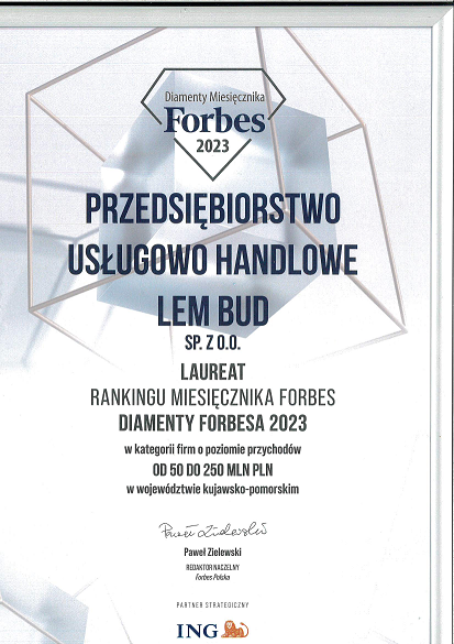 Nasze sukcesy zostały uhonorowane przez prestiżowe instytucje i publikacje. Znaleźliśmy się w rankingu Forbes „Forum Firm Rodzinnych 2023” w kategorii firm o przychodach poniżej 100 mln PLN w województwie kujawsko-pomorskim. Ponadto zostaliśmy uznani za jednego z liderów w branży deweloperskiej, zajmując drugie miejsce w województwie kujawsko-pomorskim w rankingu Builder i plasując się wśród 100 największych firm deweloperskich w Polsce. Prestiżowe wyróżnienie Diament Forbes 2023 oraz ujęcie w raporcie PwC, gdzie Lem-Bud został sklasyfikowany jako jedna ze stu największych firm deweloperskich w Polsce, podkreślają znaczący wkład naszej firmy w rozwój branży